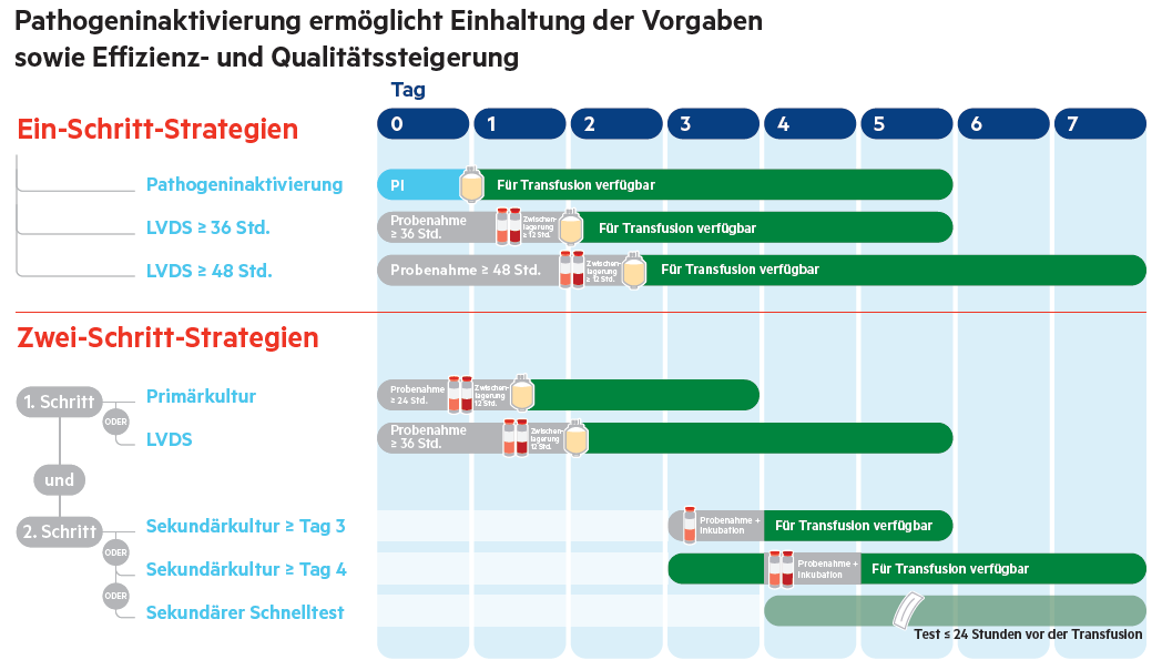 Blutspendezentren, bei denen das Verfahren der Pathogeninaktivierung bereits im Einsatz ist, müssen keine Änderungen vornehmen, um die neue Leitlinie der FDA einzuhalten. Dank PI entsprechen die Verfahren und Produkte bereits den Vorgaben des neuen Standards. Bei Blutspendezentren, die mit Systemen zur Bakterientestung arbeiten, hängt die Einhaltung der FDA-Vorgaben von den Prozessen ab. Die FDA-Leitline enthält mehrere Optionen für die Bakterientestung, durch die der Mindeststandard bei entsprechender Implementierung eingehalten wird.